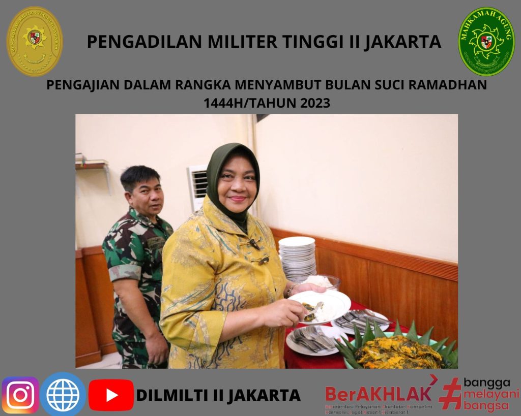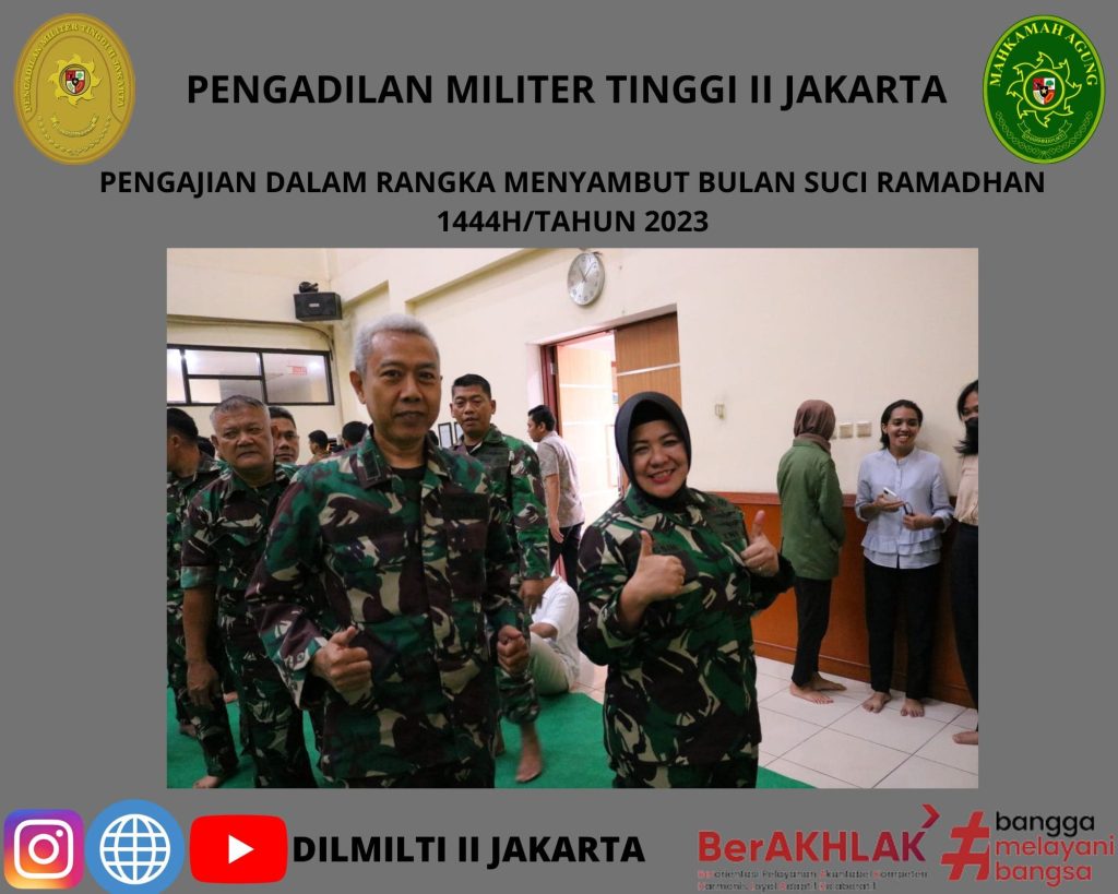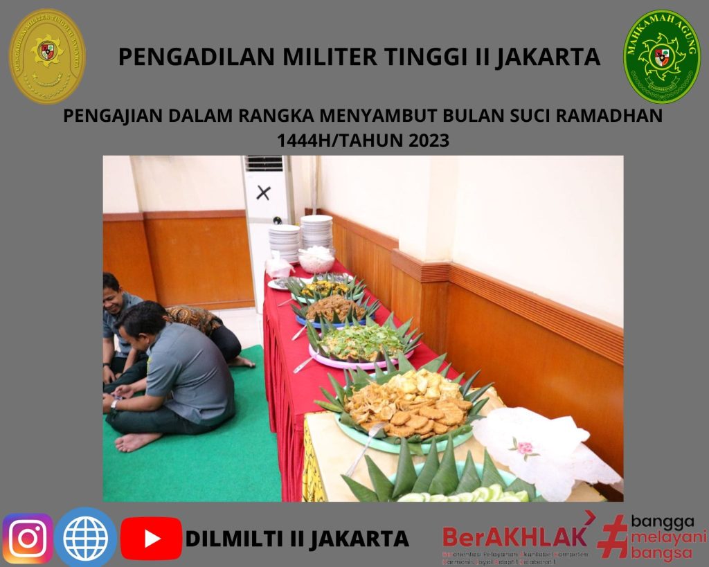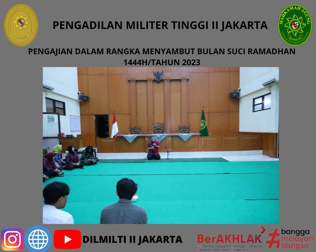 Pengadilan Militer Tinggi II Jakarta mengadakan acara pengajian dalam rangka menyambut bulan Suci Ramadhan 1444 H dengan tema “Sucikan Hati, Sucikan Jiwa dan Bersihkan Pikiran”, kegiatan ini dihadiri oleh seluruh anggota. Acara dilaksanakan di ruang Sidang Utama yang diawali dengan pembacaan yasin bersama, dan dilanjutkan dengan ceramah agama oleh PNS Zidny Taqiyya, S.I.P.