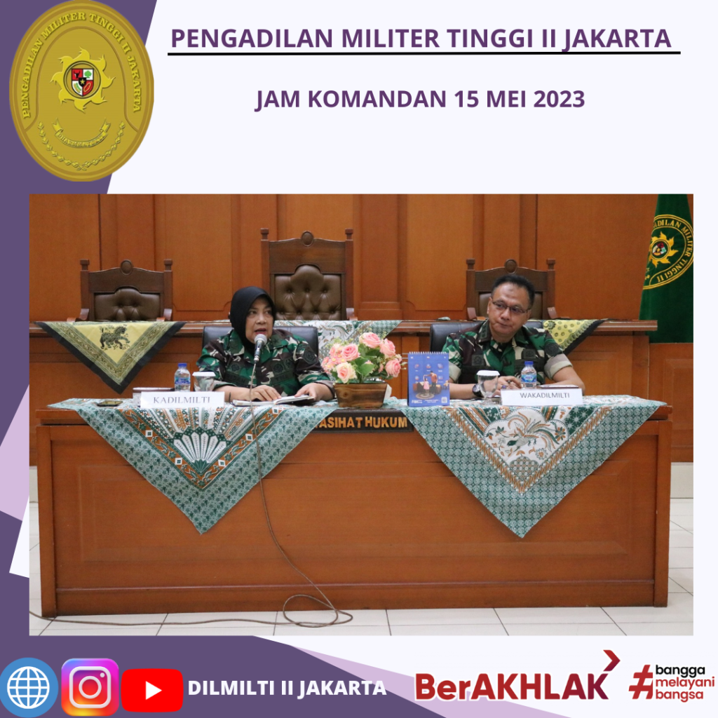 Pada hari Senin tanggal 15 Mei 2023 pukul 09.00 WIB, Kepala Pengadilan Militer Tinggi II Jakarta memimpin Jam Komandan sekaligus Rapat Monitoring dan Evaluasi Kinerja Bulanan yang dihadiri oleh seluruh anggota Pengadilan Militer Tinggi II Jakarta. Acara ini bertempat di Ruang Sidang Utama, Pengadilan Militer Tinggi II Jakarta. Acara diawali dengan ucapan syukur kepada Tuhan Yang Maha Esa atas segala karunia-Nya yang telah memberikan kesehatan sehingga seluruh anggota dapat berkumpul dan hadir untuk mengikuti acara ini. Dalam Jam Komandan kali ini, ada beberapa hal yang disampaikan oleh Kadilmilti II Jakarta, yaitu :