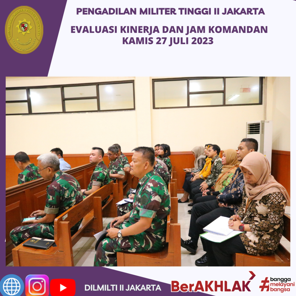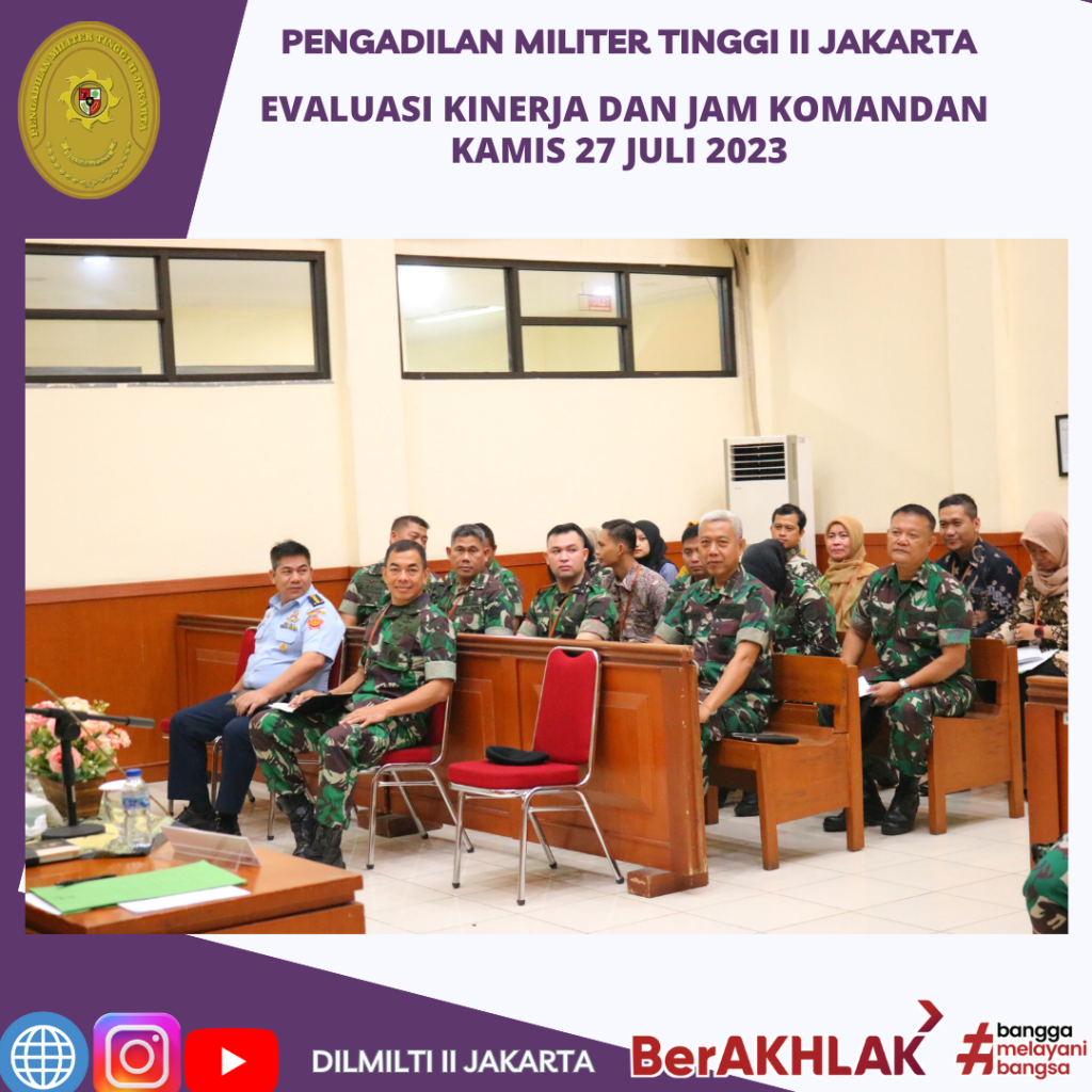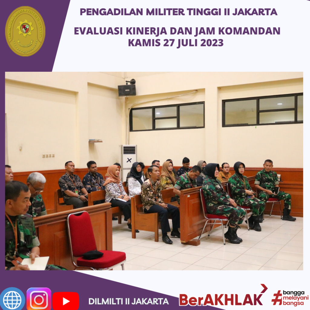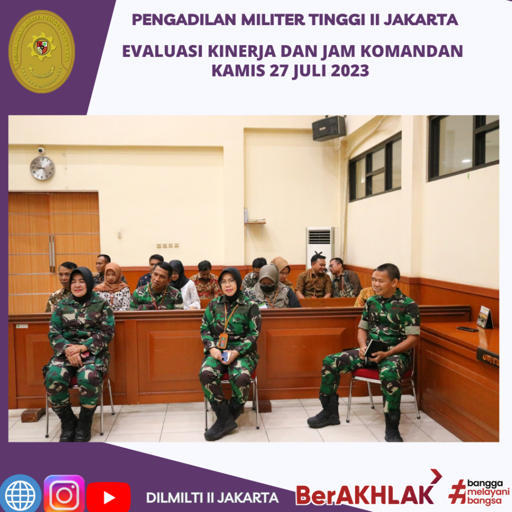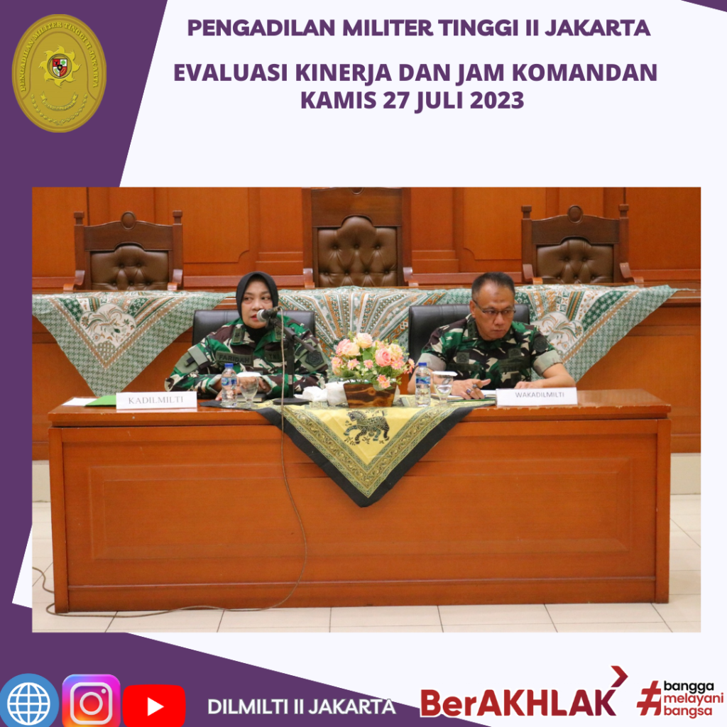 Pada hari Senin tanggal 27 Juli 2023 pukul 09.00 WIB, Kepala Pengadilan Militer Tinggi II Jakarta memimpin Jam Komandan dan Evaluasi Kinerja Bulanan yang dihadiri oleh seluruh anggota Pengadilan Militer Tinggi II Jakarta. Acara ini bertempat di Ruang Sidang Utama, Pengadilan Militer Tinggi II Jakarta. Acara diawali dengan ucapan syukur kepada Tuhan Yang Maha Esa atas segala karunia-Nya yang telah memberikan kesehatan sehingga seluruh anggota dapat berkumpul dan hadir untuk mengikuti acara ini. Dalam Jam Komandan kali ini, ada beberapa hal yang disampaikan oleh Kadilmilti II Jakarta, yaitu :