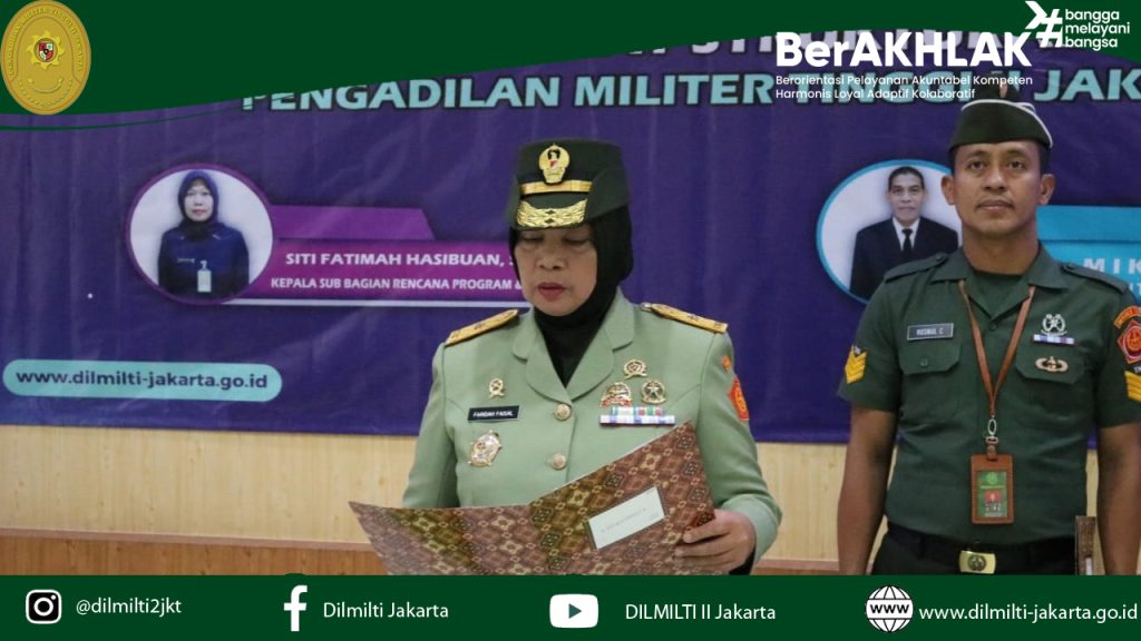 Jakarta, 30 Oktober 2023, bertempat di Ruang Media Center Pengadilan Militer Tinggi II Jakarta telah diadakan Acara Pelantikan dan Pengambilan Sumpah Jabatan Para Pejabat Struktural. Bertindak selalu Pimpinan Acara yaitu Kepala Pengadilan Militer Tinggi II Jakarta Brigadir Jenderal TNI Faridah Faisal, S.H., M.H. Para Pejabat struktural yang dilantik pada hari ini yaitu PNS Siti Fatimah Hasibuan, S.H., M.H. sebagai Kasubbag Perencanaan Program Dan Anggaran, PNS Mikun, A.Md. sebagai Kasubbag Tata Usaha Dan Rumah Tangga.