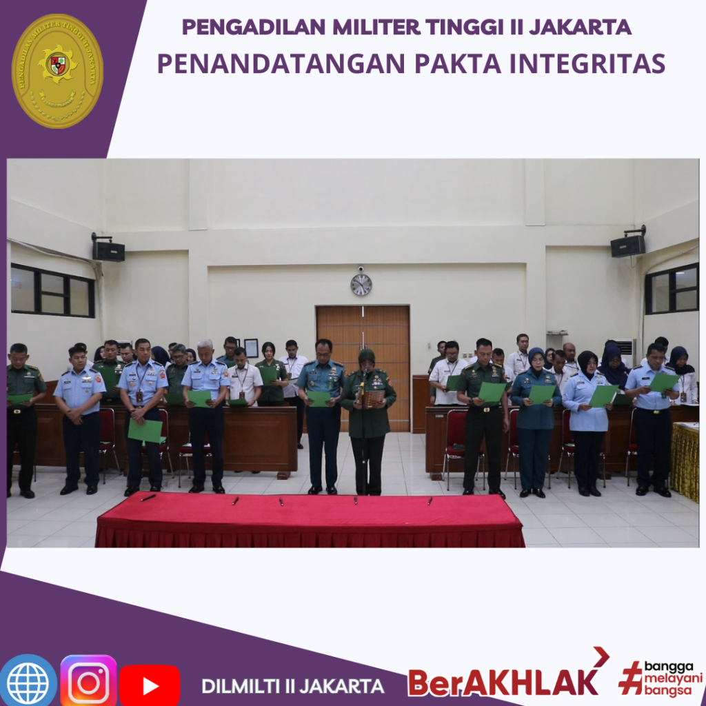 Jakarta, 15 Januari 2024 Pengadilan Militer Tinggi II Jakarta dengan pimpinan Kadilmilti Brigadir Jenderal TNI Faridah Faisal, S.H., M.H. mengadakan kegiatan Pembacaan dan Penandatanganan Pakta Integritas Tahun 2024 dilaksanakan di Ruang Sidang Utama.
