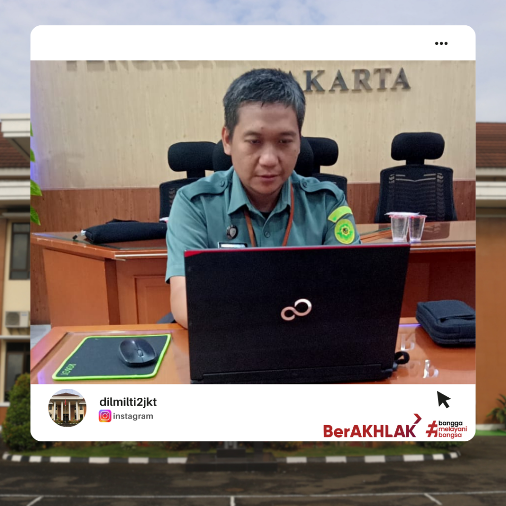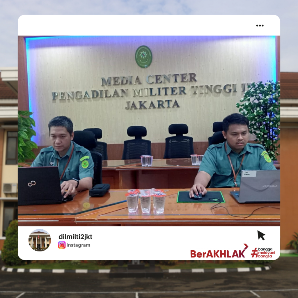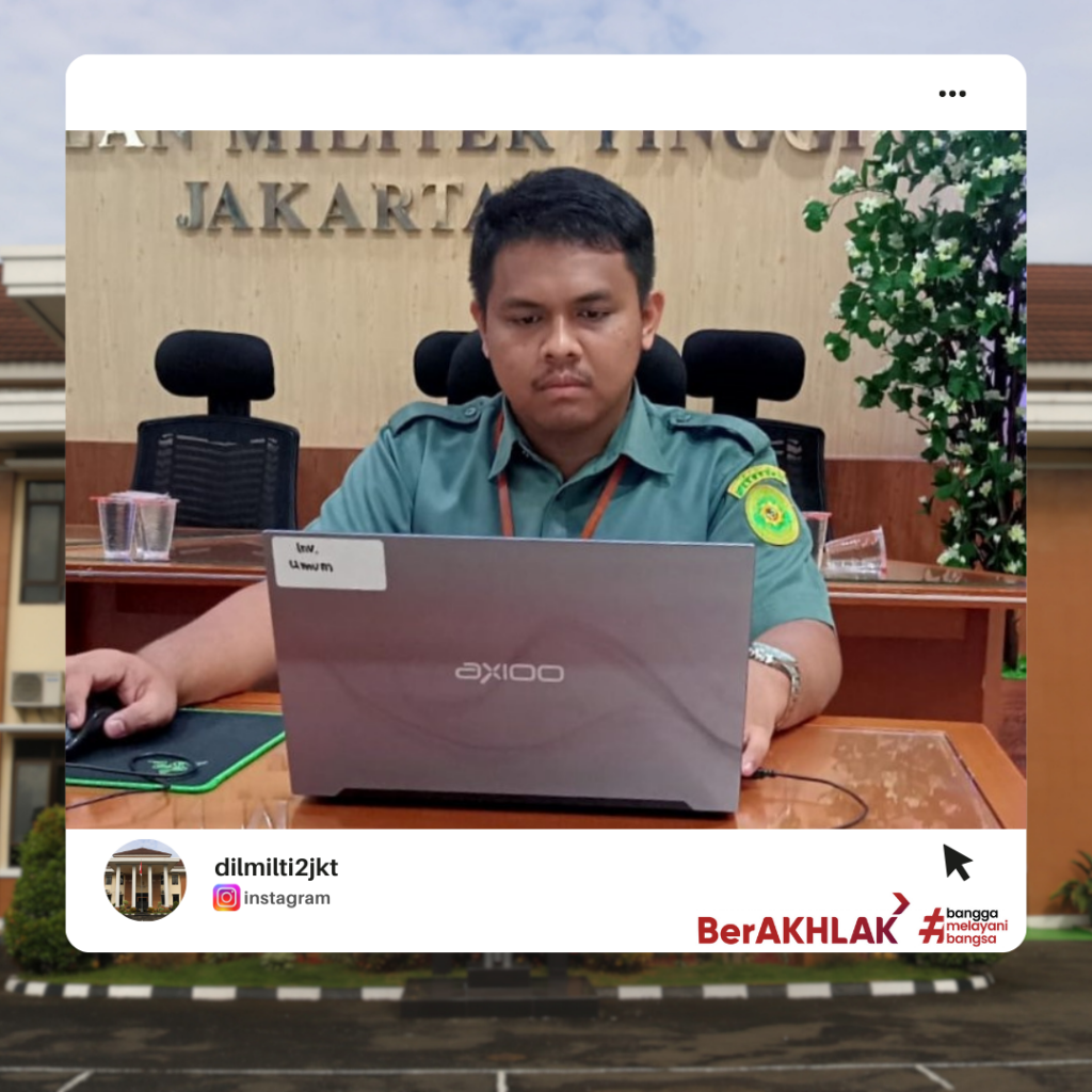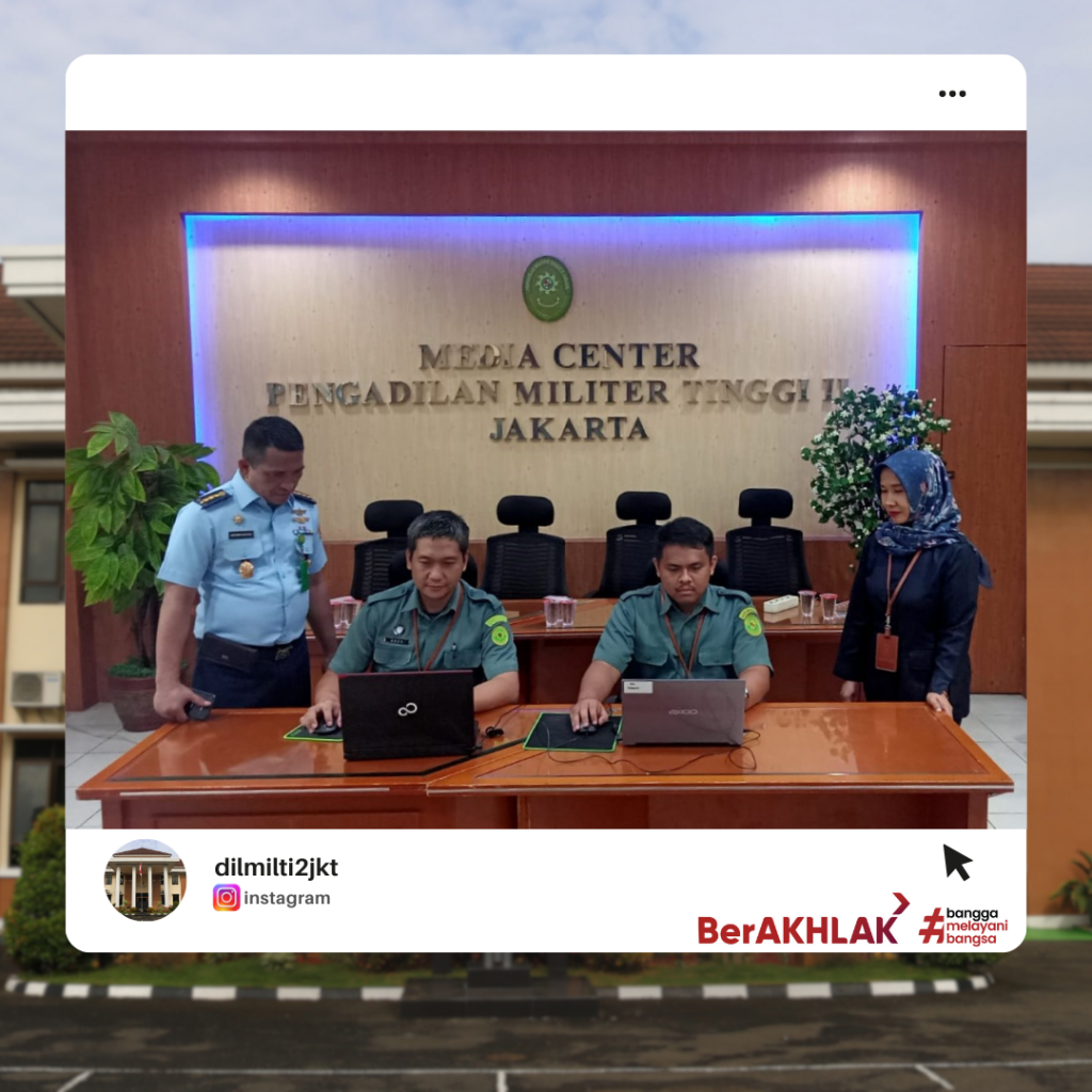 Jakarta, Selasa 7 Mei 2024 bertempat di ruang media centre Pengadilan Militer Tinggi II Jakarta, dilaksanakan Ujian Dinas Elektronik (e-Exam) Tahun 2024 Batch 1 Tahap 3. Ujian ini diikuti oleh 2 (dua) orang anggota PNS Dilmilti II Jakarta, yaitu Agus dan Mohammad Wildan, keduanya mengikuti Ujian Penyesuaian Ijazah S1. Dalam pelaksanaan ujian ini, Sekretaris Dilmilti II Jakarta Kolonel Kum Abuzar Hafari, S.H., M.H. dan Kasubbag Kepegawaian dan TI PNS Cahyani Nurpriyanti, S.H. bertindak sebagai pengawas. Ujian berjalan dengan lancar dan tidak terjadi pelanggaran.