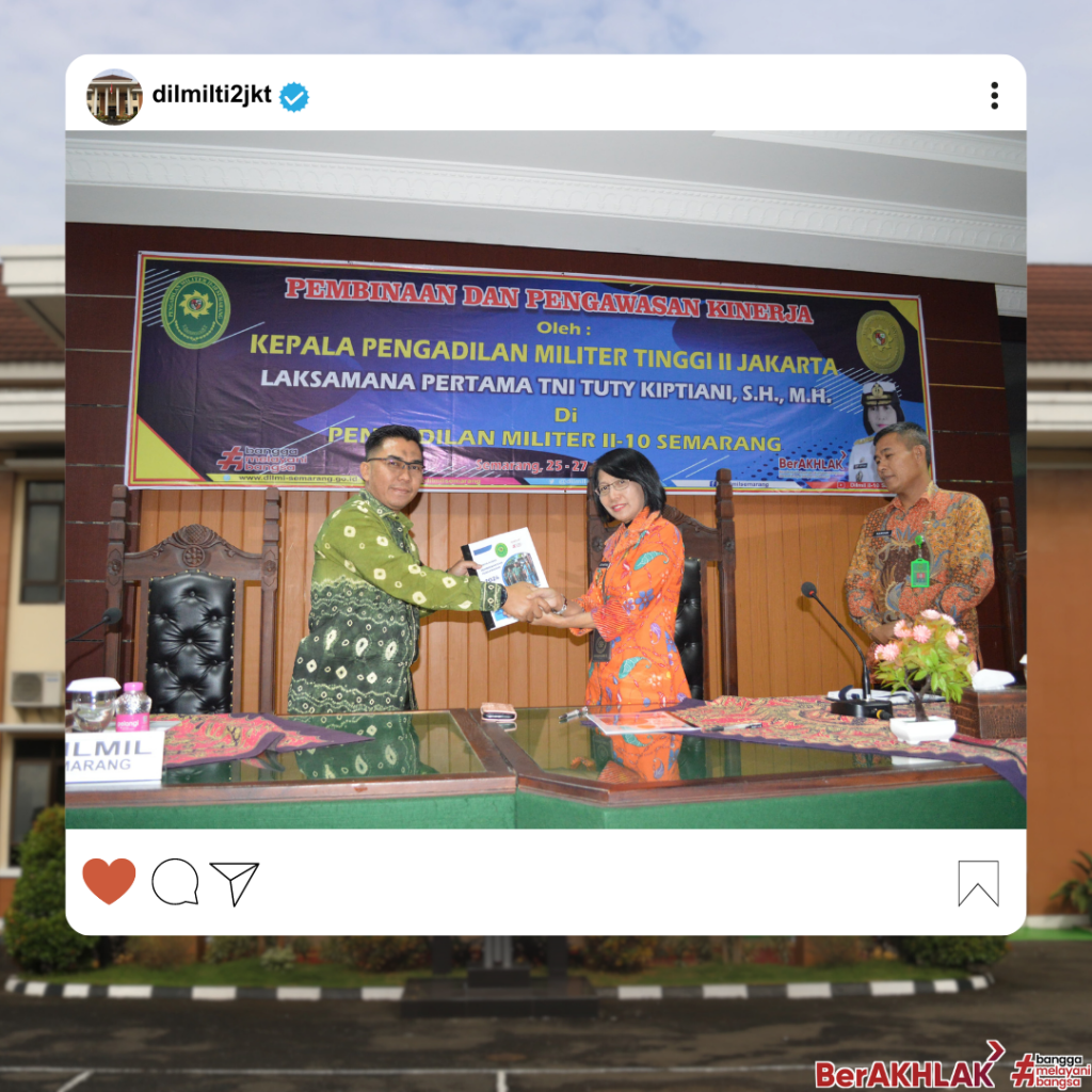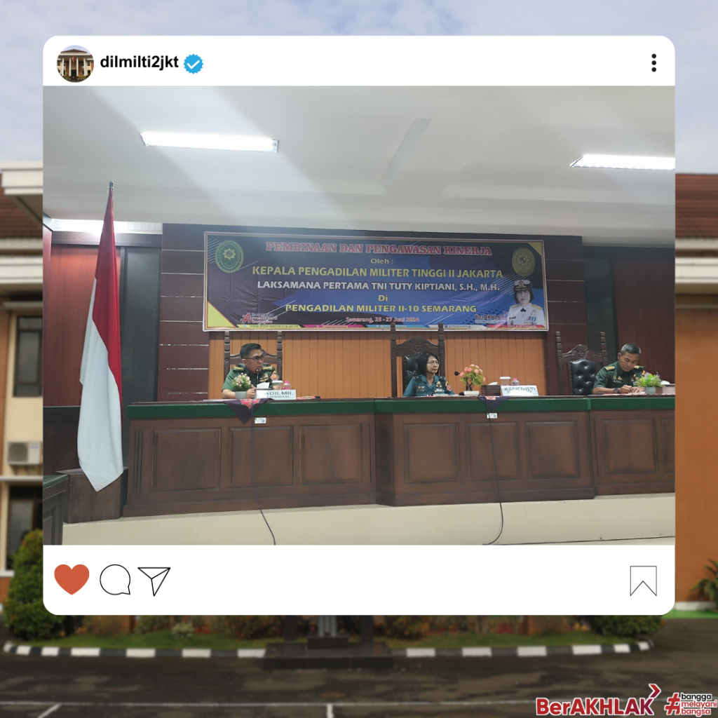 Semarang, 25 s.d. 27 Juni 2024. Kepala Pengadilan Militer Tinggi II Jakarta Laksamana Pertama TNI Tuty Kiptiani, S.H., M.H. dengan didampingi oleh Kepala Bagian Perencanaan dan Kepegawaian serta seorang Staff melaksanakan kegiatan Pembinaan dan Pengawasan Daerah ke Pengadilan Militer II – 10 Semarang.