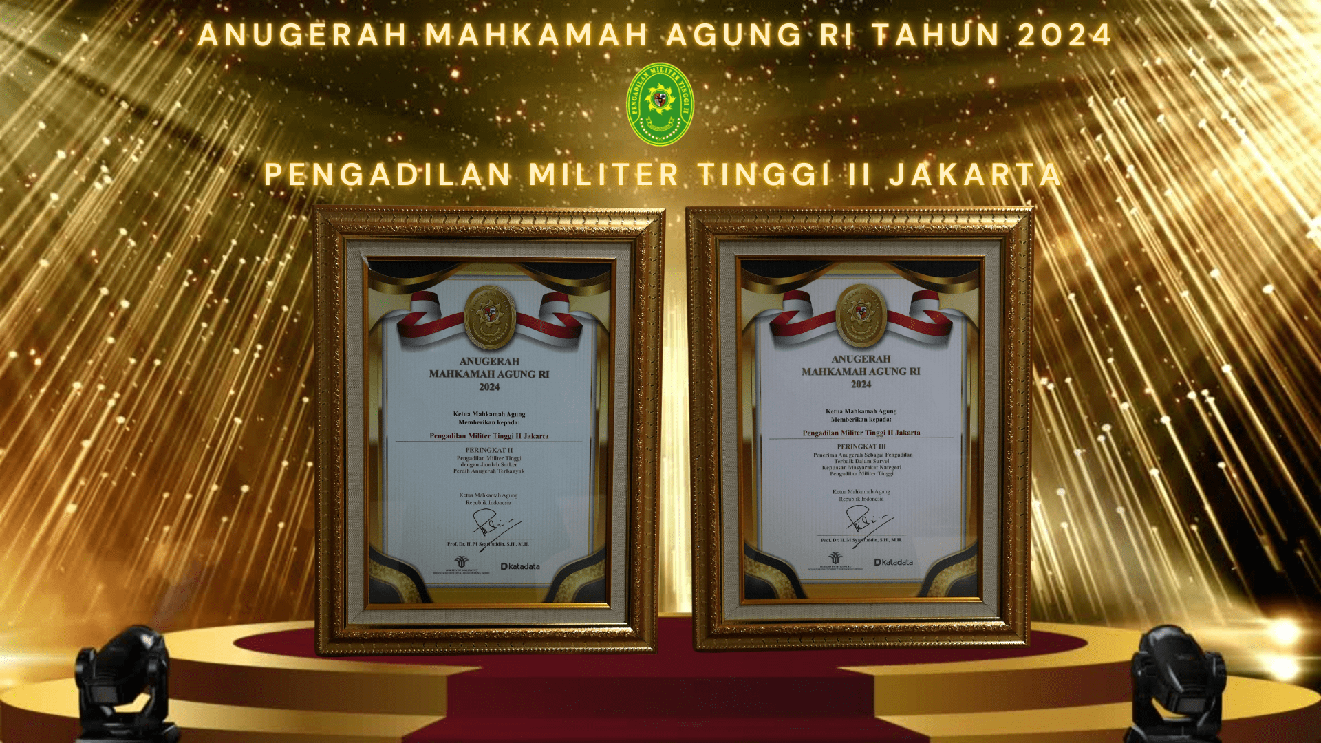 Jakarta 19 Agustus 2024, Mahkamah Agung Republik Indonesia setiap tahun saat moment Hari Ulang Tahun-nya selalu memberikan Anugerah kepada satuan kerja di 4 (empat) lingkungan Peradilan sebagai apresiasi dan penghargaan baik kepada pihak eksternal yang telah mendukung maupun kepada aparatur peradilan yang melaksanakan kebijakan pembaharuan dalam rangka peningkatan pelayanan keadilan. Anugerah diberikan sesuai analisis data dan penilaian di bidang pelaksanaan peradilan elektronik, e-berpadu, gugatan sederhana, mediasi, kinerja layanan, keterbukaan informasi dan survei kepuasan masyarakat. Pada tahun 2024 ini Pengadilan Militer Tinggi II Jakarta meraih 3 (tiga) buah penghargaan yang selayaknya patut dibanggakan yaitu :