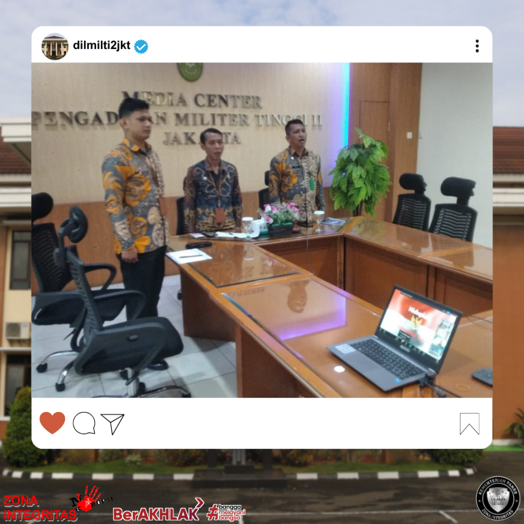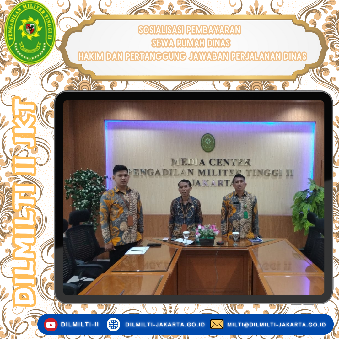 Jakarta, 6 September 2024. Kuasa Pengguna Anggaran Kolonel Kum Abuzar Hafari, S.H., M.H. selaku Sekretaris didampingi Pejabat Pembuat Komitmen dan Bendahara Pengeluaran Pengadilan Militer Tinggi II Jakarta mengikuti kegiatan sosialisasi pembayaran sewa rumah dinas dan pertanggung jawaban perjalanan dinas oleh Biro Keuangan Mahkamah Agung RI yang diselenggarakan secara daring, zoom dilaksanakan di ruang Media Centre.