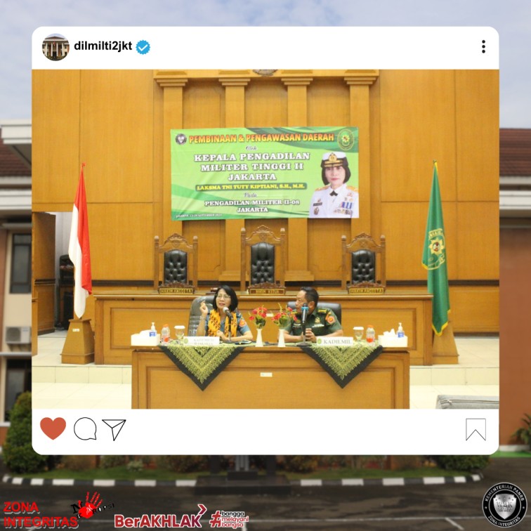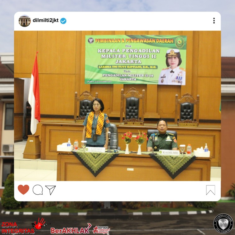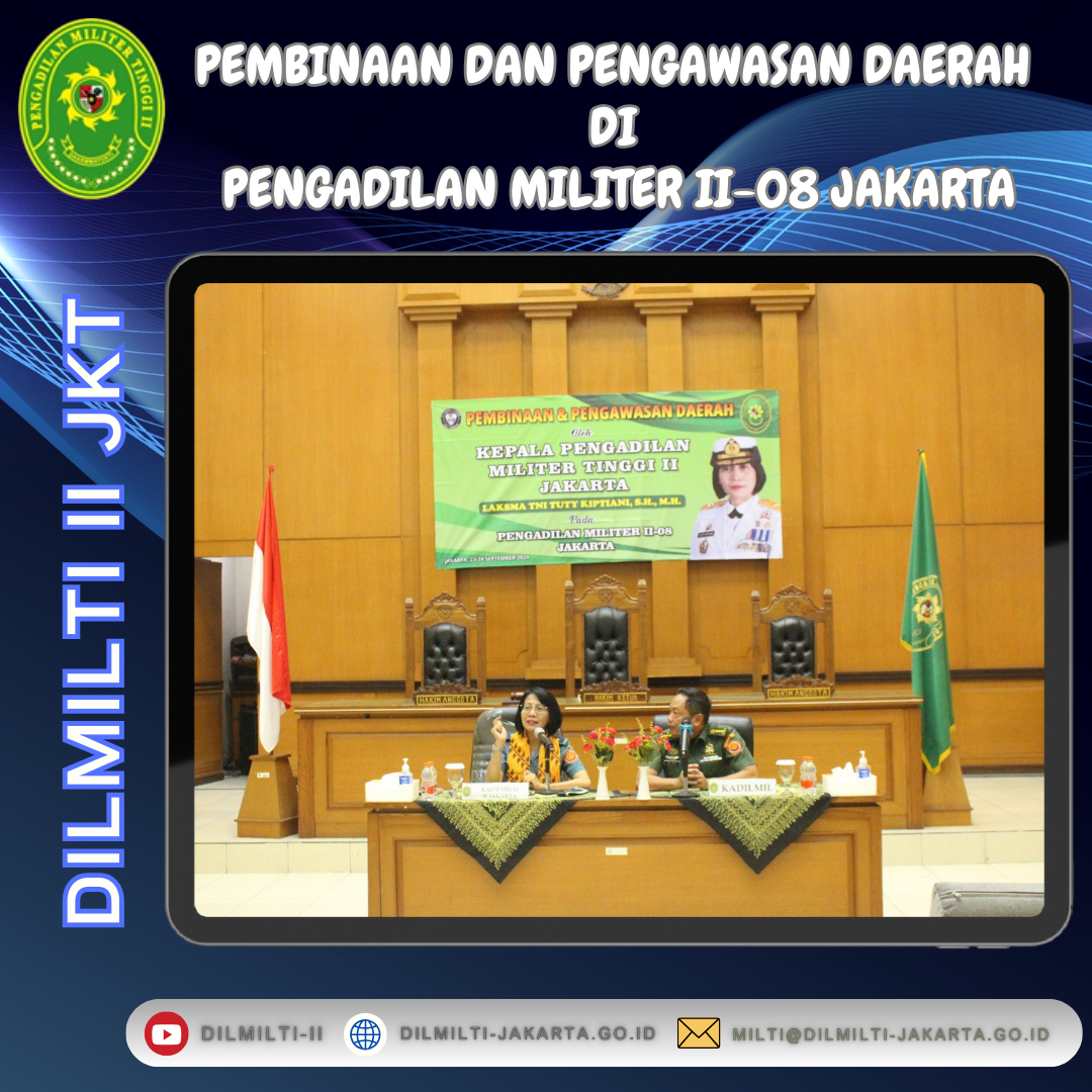 Kepala Pengadilan Militer Tinggi II Jakarta Laksamana Pertama TNI Tuty Kiptiani, S.H., M.H. dan rombongan melaksanakan fungsi pengawasan ke Pengadilan Militer II-08 Jakarta pada tanggal 23 dan 24 September 2024. Pembinaan dan pengawasan daerah ini menjadi tugas dari Pengadilan Militer Tinggi II Jakarta selaku Pengadilan Tingkat Banding yang mempunyai wilayah hukum meliputi Jakarta, Jawa Barat, Jawa Tengah dan Daerah Istimewa Yogyakarta.