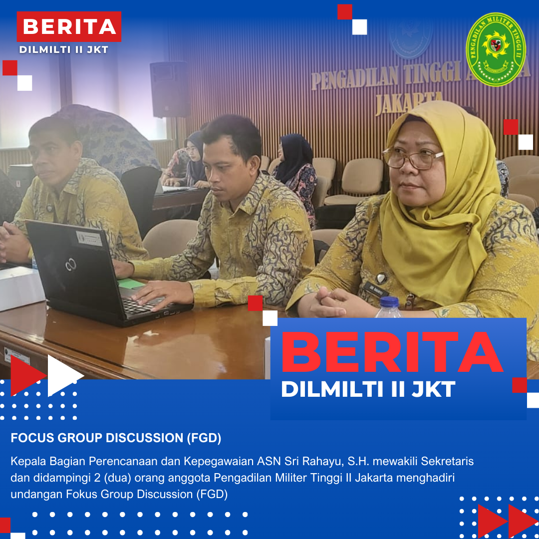 Jakarta, 10 Oktober 2024. Kepala Bagian Perencanaan dan Kepegawaian ASN Sri Rahayu, S.H. mewakili Sekretaris dan didampingi 2 (dua) orang anggota Pengadilan Militer Tinggi II Jakarta menghadiri undangan Fokus Group Discussion (FGD) Pengelolaan Barang Milik Negara Wilayah Jakarta yang bertempat di Pengadilan Tinggi Agama Jakarta.