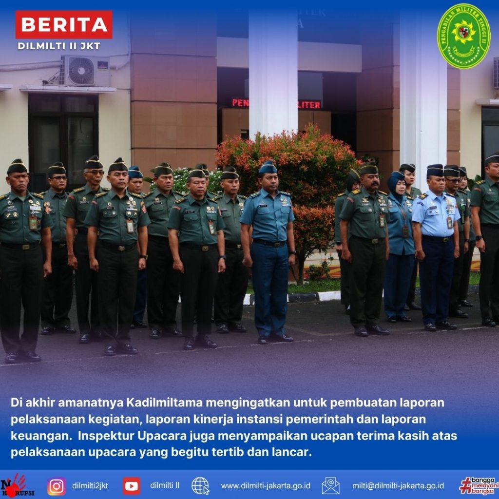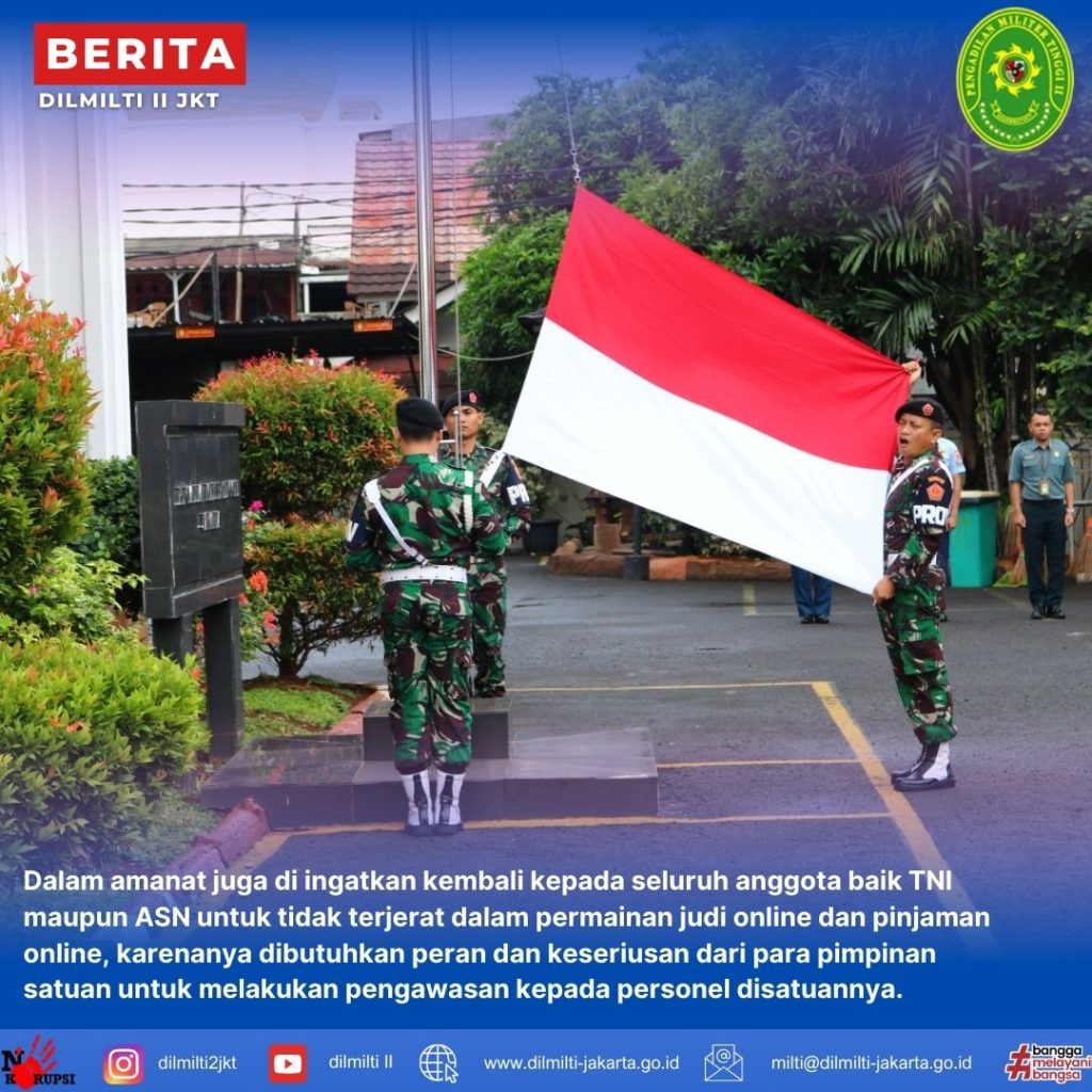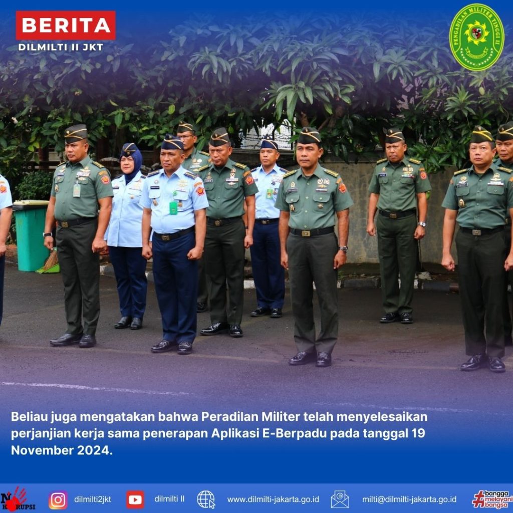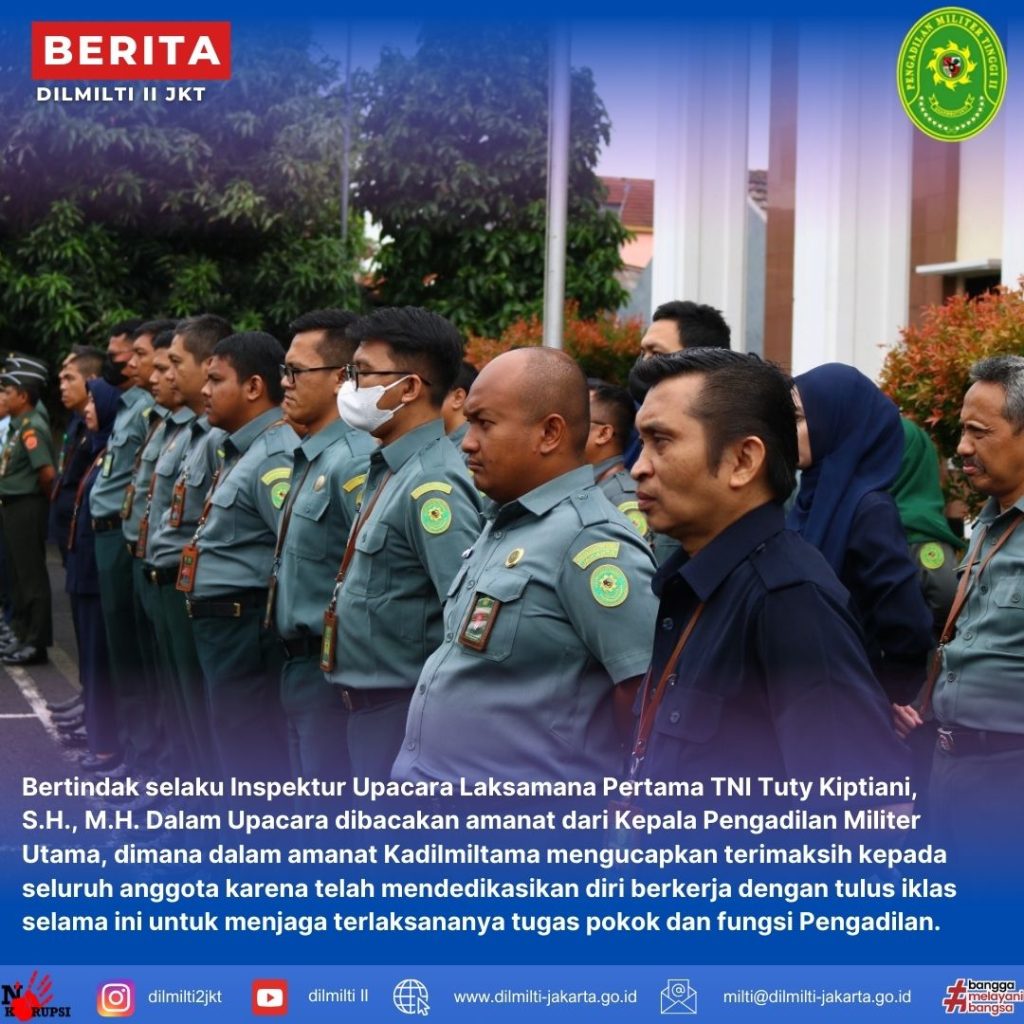 Selasa, 17 Desember 2024. Pelaksanaan Upacara Bendera tanggal 17 Desember 2024 di Lapangan Apel diikuti seluruh anggota TNI, ASN dan PPNPN pada Pengadilan Militer Utama, Pengadilan Militer Tinggi II Jakarta dan Pengadilan Militer II-08 Jakarta pada pukul 08.00 WIB. Bertindak selaku Inspektur Upacara Laksamana Pertama TNI Tuty Kiptiani, S.H., M.H. Dalam Upacara dibacakan amanat dari Kepala Pengadilan Militer Utama, dimana dalam amanat Kadilmiltama mengucapkan terimaksih kepada seluruh anggota karena telah mendedikasikan diri berkerja dengan tulus iklas selama ini untuk menjaga terlaksananya tugas pokok dan fungsi Pengadilan. Beliau juga mengatakan bahwa Peradilan Militer telah menyelesaikan perjanjian kerja sama penerapan Aplikasi E-Berpadu pada tanggal 19 November 2024. Dalam amanat juga di ingatkan kembali kepada seluruh anggota baik TNI maupun ASN untuk tidak terjerat dalam permainan judi online dan pinjaman online, karenanya dibutuhkan peran dan keseriusan dari para pimpinan satuan untuk melakukan pengawasan kepada personel disatuannya.
