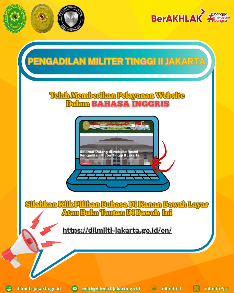 Haiiii…Sobat Pengadilan. Saat ini Website Pengadilan Militer Tinggi II Jakarta sudah dapat dibuka dengan 2 (dua) Bahasa lho, bisa dengan Bahasa Indonesia dan Bahasa Inggris.