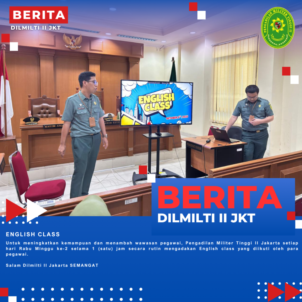 Untuk meningkatkan kemampuan dan menambah wawasan pegawai, Pengadilan Militer Tinggi II Jakarta setiap hari Rabu Minggu ke-2 selama 1 (satu) jam secara rutin mengadakan English class yang diikuti oleh para pegawai.