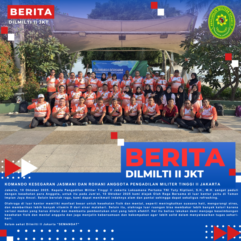 Jakarta, 10 Oktober 2025. Kepala Pengadilan Militer Tinggi II Jakarta Laksamana Pertama TNI Tuty Kiptiani, S.H., M.H. sangat peduli dengan kesehatan para Anggota, untuk itu pada Jum’at, 10 Oktober 2025 kami diajak Olah Raga Bersama di luar kantor yaitu di Taman Impian Jaya Ancol. Selain berolah raga, kami dapat menikmati indahnya alam dan pantai sehingga dapat sekaligus refreshing.