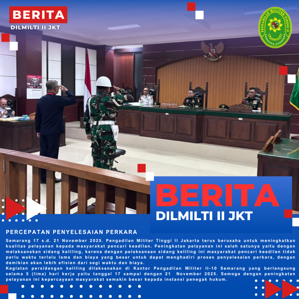 Semarang 17 s.d. 21 November 2025. Pengadilan Militer Tinggi II Jakarta terus berusaha untuk meningkatkan kualitas pelayanan kepada masyarakat pencari keadilan. Peningkatan pelayanan ini salah satunya yaitu dengan melaksanakan sidang keliling, karena dengan pelaksanaan sidang keliling ini masyarakat pencari keadilan tidak perlu waktu terlalu lama dan biaya yang besar untuk dapat menghadiri proses penyelesaian perkara, dengan demikian akan lebih efisien dari segi waktu dan biaya.